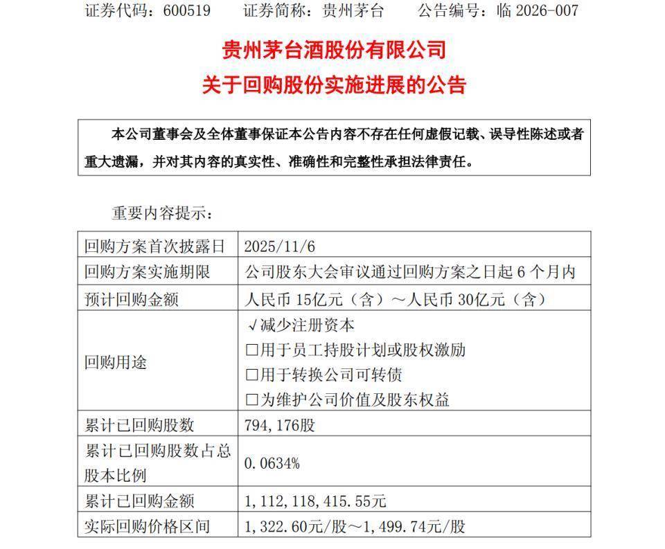 此前,贵州茅台于2025年11月28日召开2025年第一次临时鼓动大会,审议通过了《对于以贴近竞价交游容貌回购公司股份的决策》,并于2025年12月25日败露了《对于以贴近竞价交游容貌回购公司股份的回购讲明书》,公司将以自有资金通过贴近竞价交游容貌回购股份,用于刊出并减少注册本钱,回购价钱不进步1863.67元/股(含),回购金额不低于15亿元(含)且不进步30亿元(含),实施期限为自公司鼓动大会审议通过回购决策之日起6个月内。
